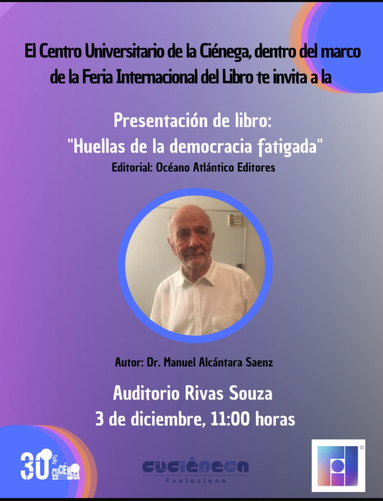 - Presentación de «Huellas de la Democracia Fatigada», de Manuel Alcántara. 3 de diciembre. 11.00. Centro Universitario de la Ciénaga de la Universidad de Guadalajara.