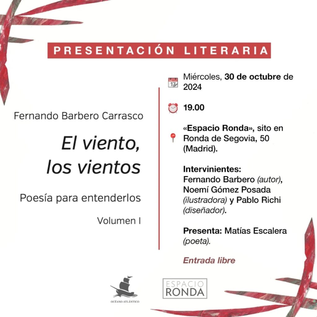 «El viento, los vientos. Poesía para entenderlos» es el nuevo trabajo de la editorial hispano–mexicana Océano Atlántico Editores. Se trata de un poemario ilustrado y bilingüe –en castellano y árabe–, protagonizado por diversas composiciones escritas por Fernando Barbero. Se encuentra traducido al árabe por Hosni Miliat, en colaboración con Yacine Nadji.